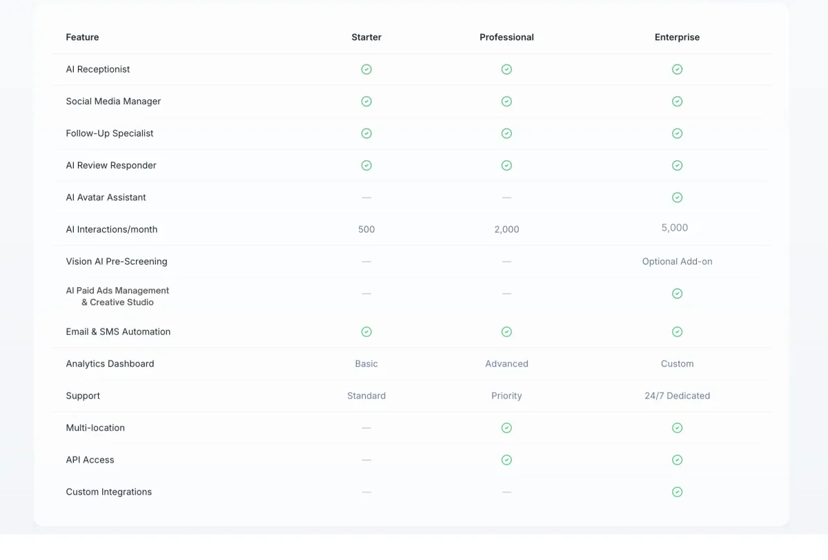 See exactly which AI employees, features, and usage limits are included at each level.